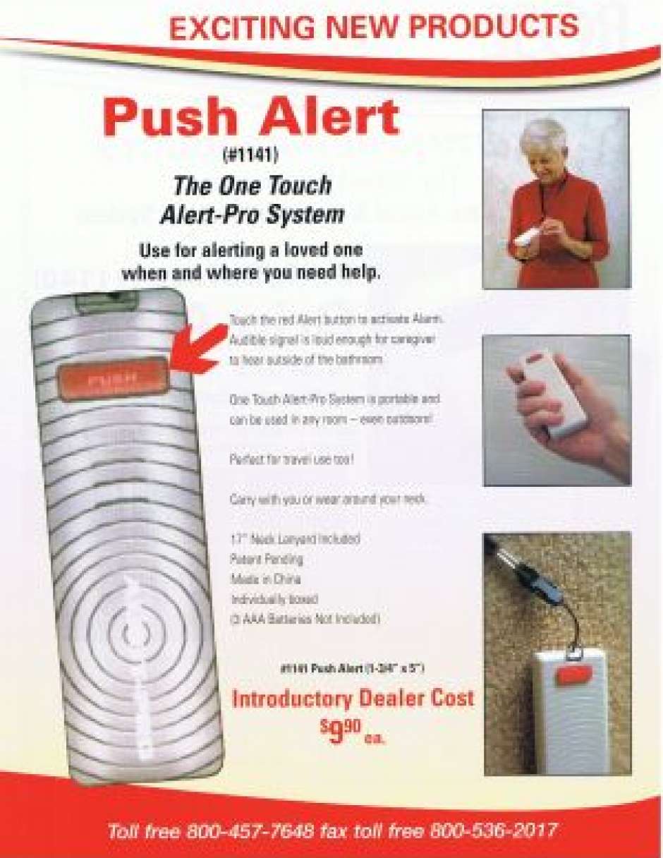The One Touch Alert-Pro System Use for alerting a loved one when and where you need help. Touch the red Alert button to activate Alarm. Audible signal is loud enough for caregiver to hear outside of the bathroom. One Touch Alert-Pro System is portable and can be used in any room -- even outdoors! Perfect for travel use too! Carry with you or wear around your neck. 17” Neck Lanyard Included Patent Pending Made in China Individually boxed (3 AAA Batteries Not Included)