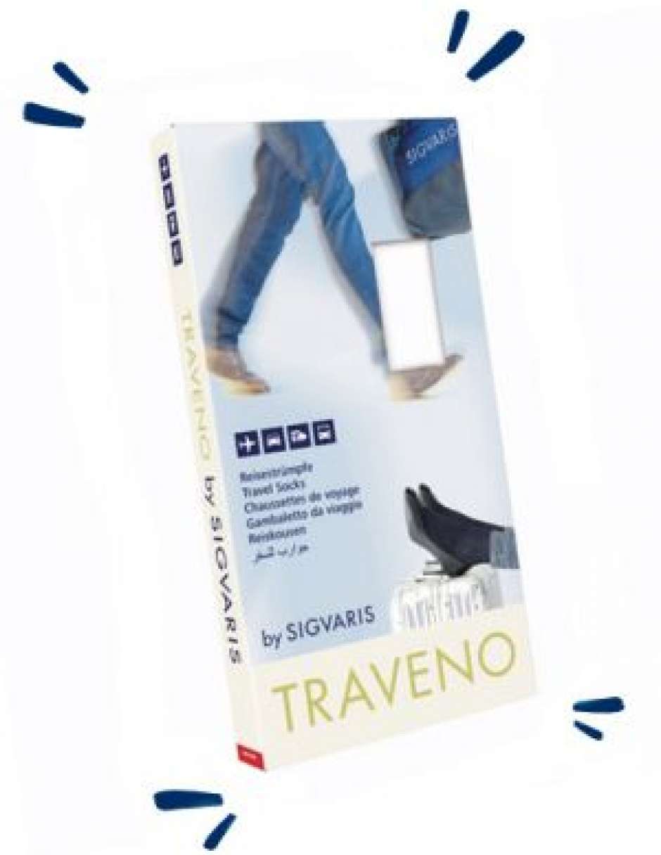 Every time you sit for a long period of time without moving your legs, the risk of travel thrombosis increases – whether you're traveling by air, car, or train. Swelling and painful legs are possible symptoms. Traveno promotes circulation in your legs by applying gentle pressure. A scientific study has proven that Sigvaris Traveno provides considerable health benefits.
