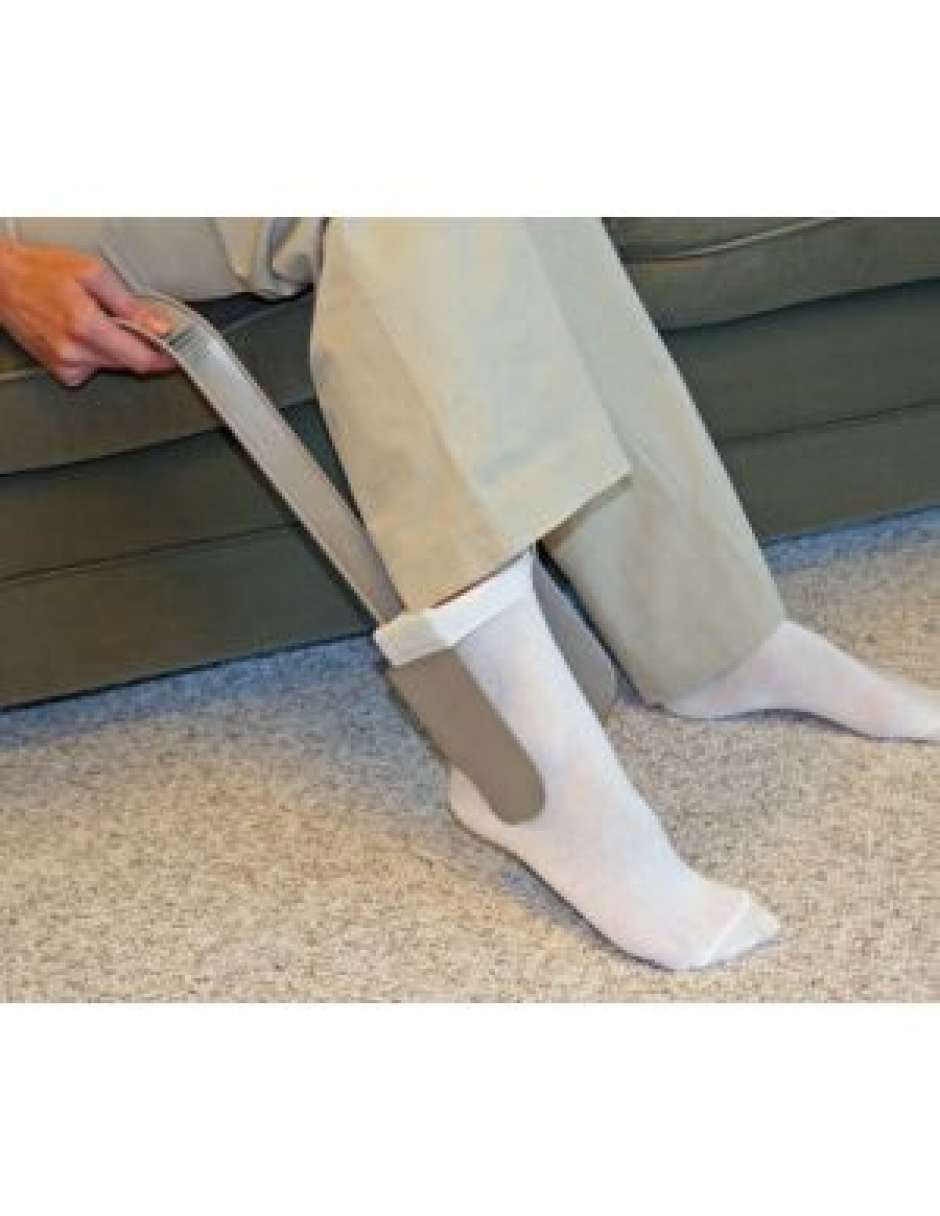 Helps you put on your socks quickly and easily Easiest and fastest sock tool on the market Extra-long handle, ribbed thumb grips, ergonomic hand contour Doesn't stretch out socks, just the top of the sock goes on the grips, Helps those with weaker hands Skin never touches the hard plastic Rubber grips are gentle on even the most delicate socks and nylons Guides cradle your leg, steadying the tool while inserting sock on to tool Two tools in one; the bottom guides can be used as a long-handled shoehorn Gender neutral taupe color with clean white grips Works well for people with these conditions Back, knee, and hip problems Decreased flexibility Pregnant mothers Overweight Compatible Sock Types Most types of men's and women's socks, including: Crew socks Tube socks Ankle socks Sports socks Product Information Easy to Use Item #: 00740 Color: Taupe Package type: Self-hanging with attached header card Retail Package Specifications: 18" x 4" x 6", (0.3 lbs)
