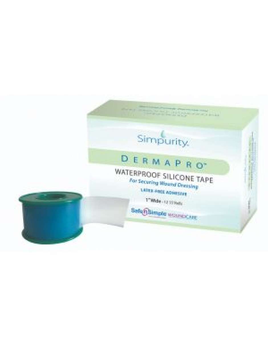 Simpurity DermaPro Waterproof Silicone Tape is latex free and has a silicone adhesive that is gentle to remove from sensitive skin areas. Superior for securing wound dressings and repelling moisture from outside contaminants. Contains 6-2” rolls per box.