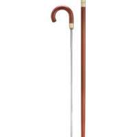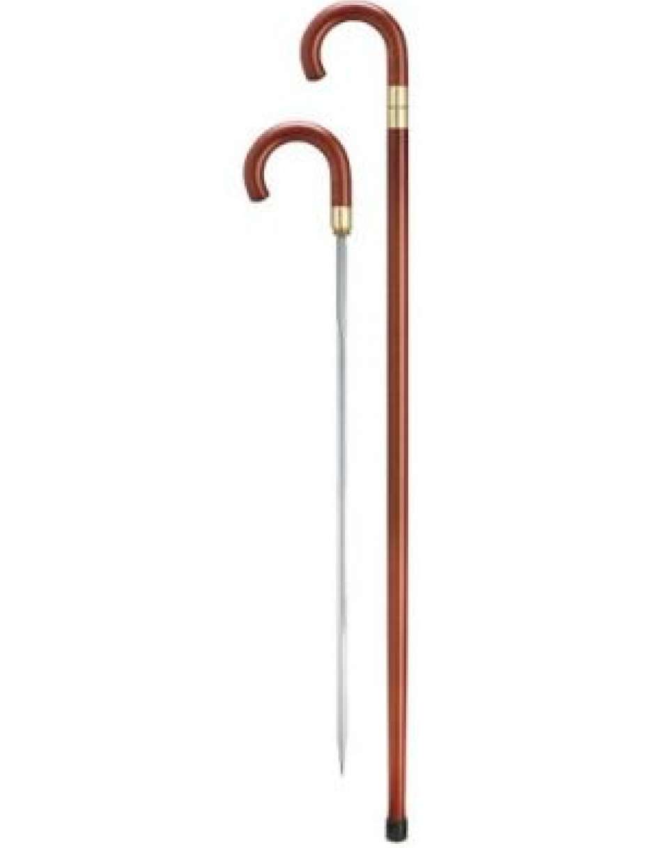 Crook shaped handle cane with a 23" long stainless steel blade concealed in the scorched wood shaft. The shaft is 36" long with a burgundy stain finish and brass accents. Collector's item. Made in the USA.