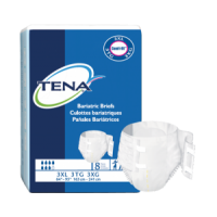 The TENA Bariatric Briefs are designed to meet the individualized needs of Bariatric residents with maximum absorbency and greater sizing flexibility. The unique feature combination of Stretch Sides with full-length hook fasteners provides secure, individualized fit. This easily customizable fit reduces product gapping and sagging for improved comfort, security and effective leakage control Suitable for men and women. Fully breathable, stretch side panels promote skin health and comfort. Hook fasteners promote easy handling and unlimited refastenability. Fortified with Odor Control Technology and Superabsorbent microbeads to help reduce odor and lock away liquids. Blue Target Absorption Zone provides extra protection where needed the most to quickly lock in liquids and odor, promoting drier, healthier skin with dignity and discretion. System with Dry Fast Core technology and strategic placement of Superabsorbent microbeads that improve surface dryness, promoting healthier skin.