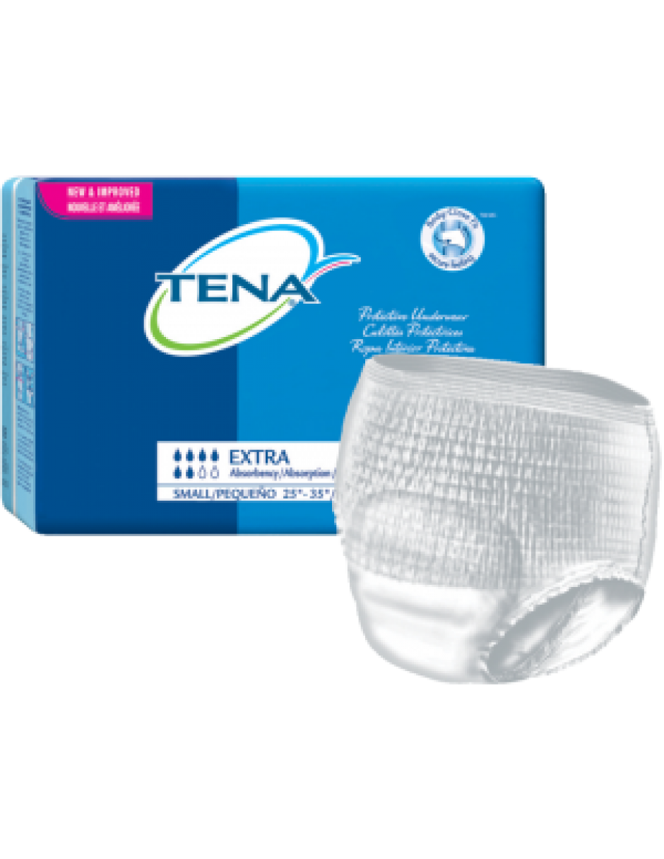 Comfort has found its closest fit yet. TENA Protective Underwear with Extra Absorbency can help with life's heaviest leaks. Whether you are moving around or laying down, you'll stay extra dry, thanks to our unique InstaDri Skin-Caring System. Fits Hips/Waist 45"-58" (114-147 cm) * Patented Body-Close Fit Technology uses more elastic threads for greater discretion and worry-free security * InstaDri Skin-Caring System improves surface dryness * Heavy protection underwear with superabsorbent microbeads for advanced leakage protection * Advanced leakage protection with premium absorbent core * Soft, cloth-like material feels as comfortable as underwear * Leg cuffs ensure a comfortable, body-close fit * Gentle waist elastic that pull on/ off like regular underwear * Tear away sides for easy, convenient removal * Standing gathers for effective leakage protection, security and comfort