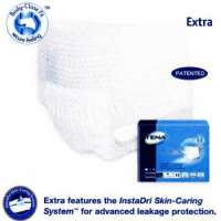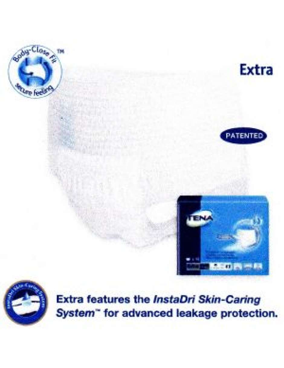 For moderate to heavy bladder leakage protection Extra features the InstaDri Skin-Caring System for advanced leakage protection. Designed for both men and women, for full coverage and extra security. New Body-Close Fit design moves with the body for more comfort and greater wearer dignity. FEATURES • PATENTED BODY-CLOSE FIT TECHNOLOGY uses more* elastic threads throughout the pant for greater discretion and worry free security. • EFFECTIVE LEAKAGE PROTECTION • SOFT, CLOTH-LIKE MATERIAL feels as comfortable as underwear. • LEG CUFFS ensure a comfortable body-close fit. • GENTLE WAIST ELASTIC allows pants to pull on and off just like underwear. No buttons or belts. • TEAR AWAY SIDES for easy, convenient removal. • STANDING GATHERS for effective leakage protection provide wearer security and comfort. • SIZING LETTERS for correct product selection and application. Size Extra Large fits waist/hip: 140-168 cm (55-66”) Available in Package/16 and Case 48 (4 packages/12)