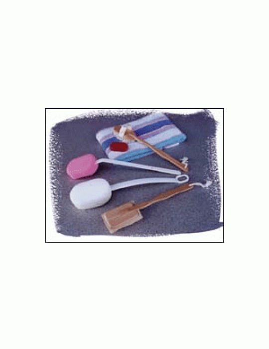 A colourful rectangular sponge mounted on a light weight epoxy coated aluminum handle. Has a vinyl hand grip to reduce slipping from wet hands. Also great for cleaning the tub without bending over. Colours may vary.